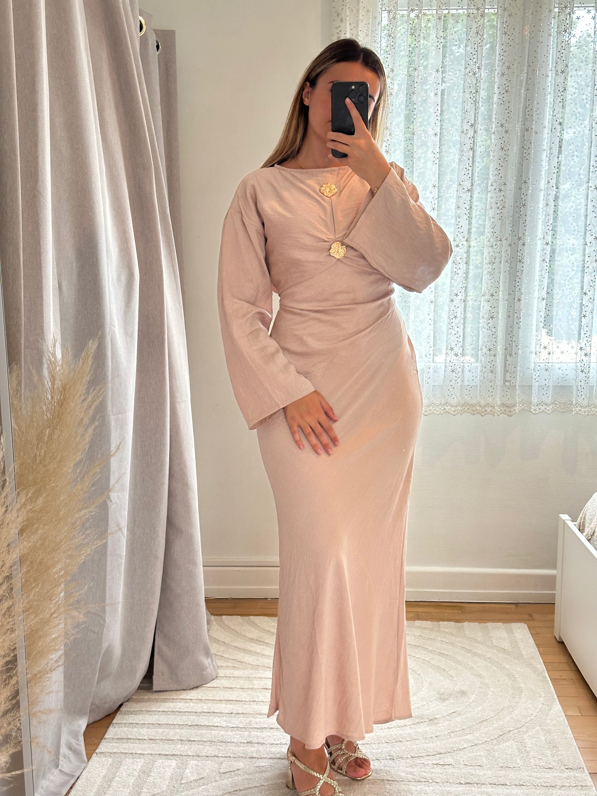 Découvrez notre superbe robe longue Safia ! Dotée d'une attache sur les côtés pour ajuster à votre taille, elle vous assure une allure élégante. Avec des détails dorés sur le haut du corps, cette robe est un véritable atout de classe.